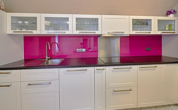 Đôi khi lại góp phần làm điểm nhấn cho cả căn nhà bởi sự nhẹ nhàng tươi mát. Những cô nàng độc thân đặc biệt có hứng thú với gam màu nữ tính này. Kính ốp bếp màu hồng sẽ vô cùng nổi bật nếu được thiết kế trong căn bếp có gam màu chủ đạo là màu trắng. Trong trắng có hồng, hồng hòa với trắng tạo sự tinh khôi thuần khiết cho không gian cũng như phong cách sống của chủ nhân căn hộ.